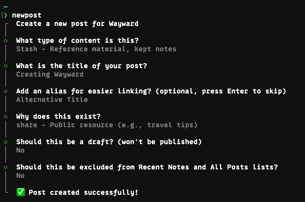 The script asks me a few simple questions to determine the type of content and a couple of things like tags and whether it should appear on lists or not. There is a small variation in the questions asked based on the type of content it is.