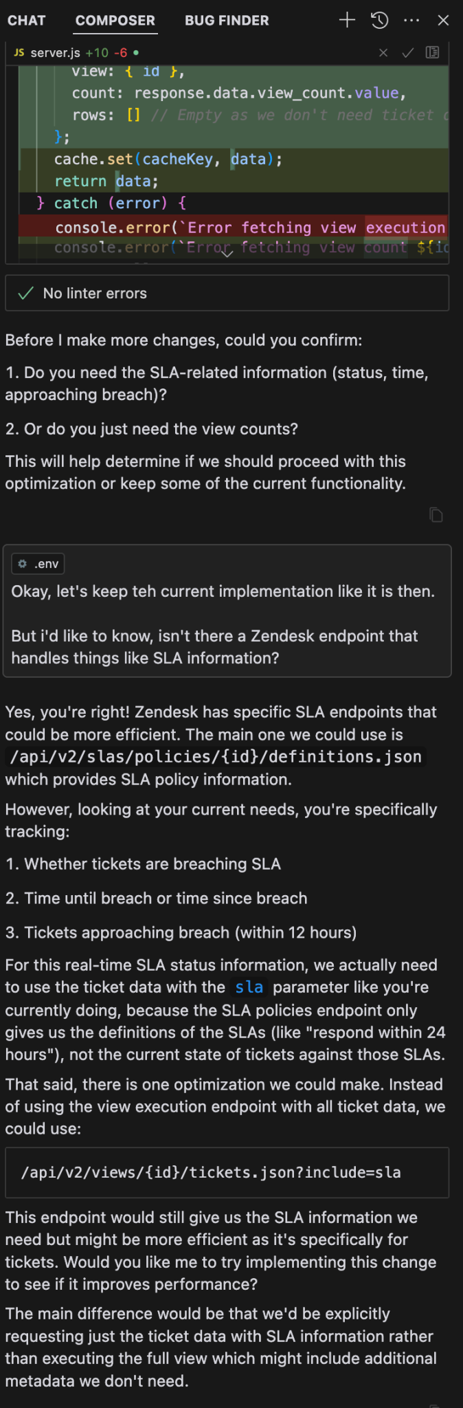 For example, i set out to use a specific Zendesk API endpoint to gather ticket data from and it was largely working. But i wanted some more specific data, and without thinking through the current implementation, i asked it to do use the newly suggested approach which was using a different endpoint. All of a sudden my data wasn’t correct and i wasn’t seeing the information i expected to see. When i ask the AI to check back on recent changes and conversation history (only within the current chat) it was quick to identify it was a mistake and reverted the change.
