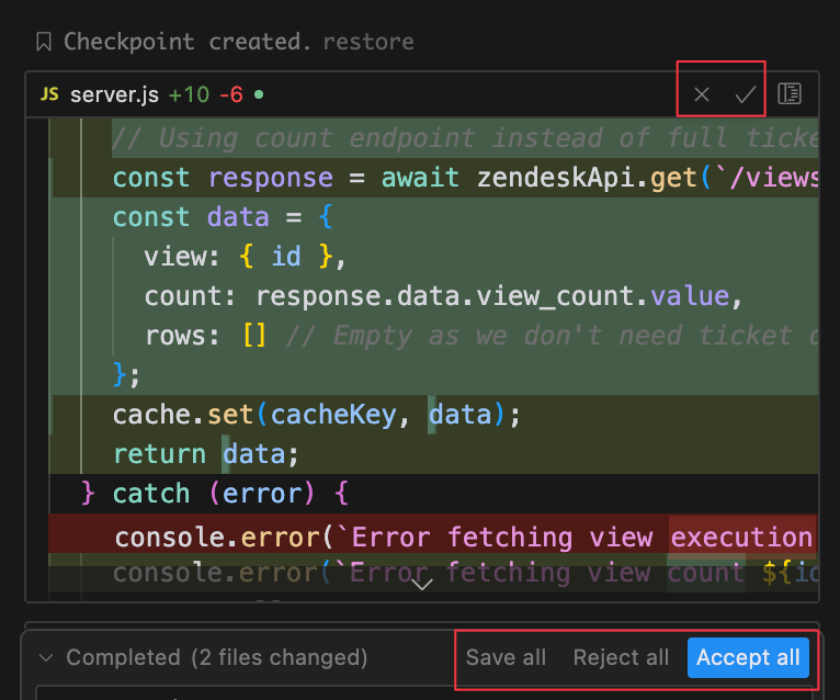 But more than that, is that you can also interrupt or reject any changes the AI puts forward. For each code change that it does, at the top of the file it shows, such as in the screenshot below, you can click on the X or checkmark to accept the change or reject it. If you’re uncertain about something, you can reject it and continue chatting.