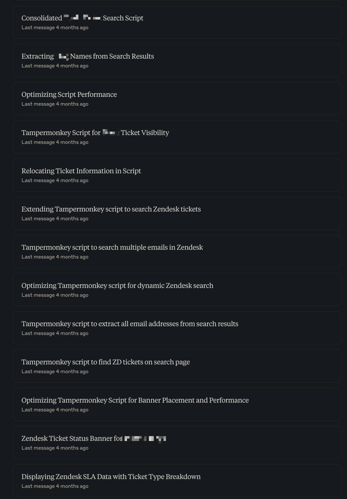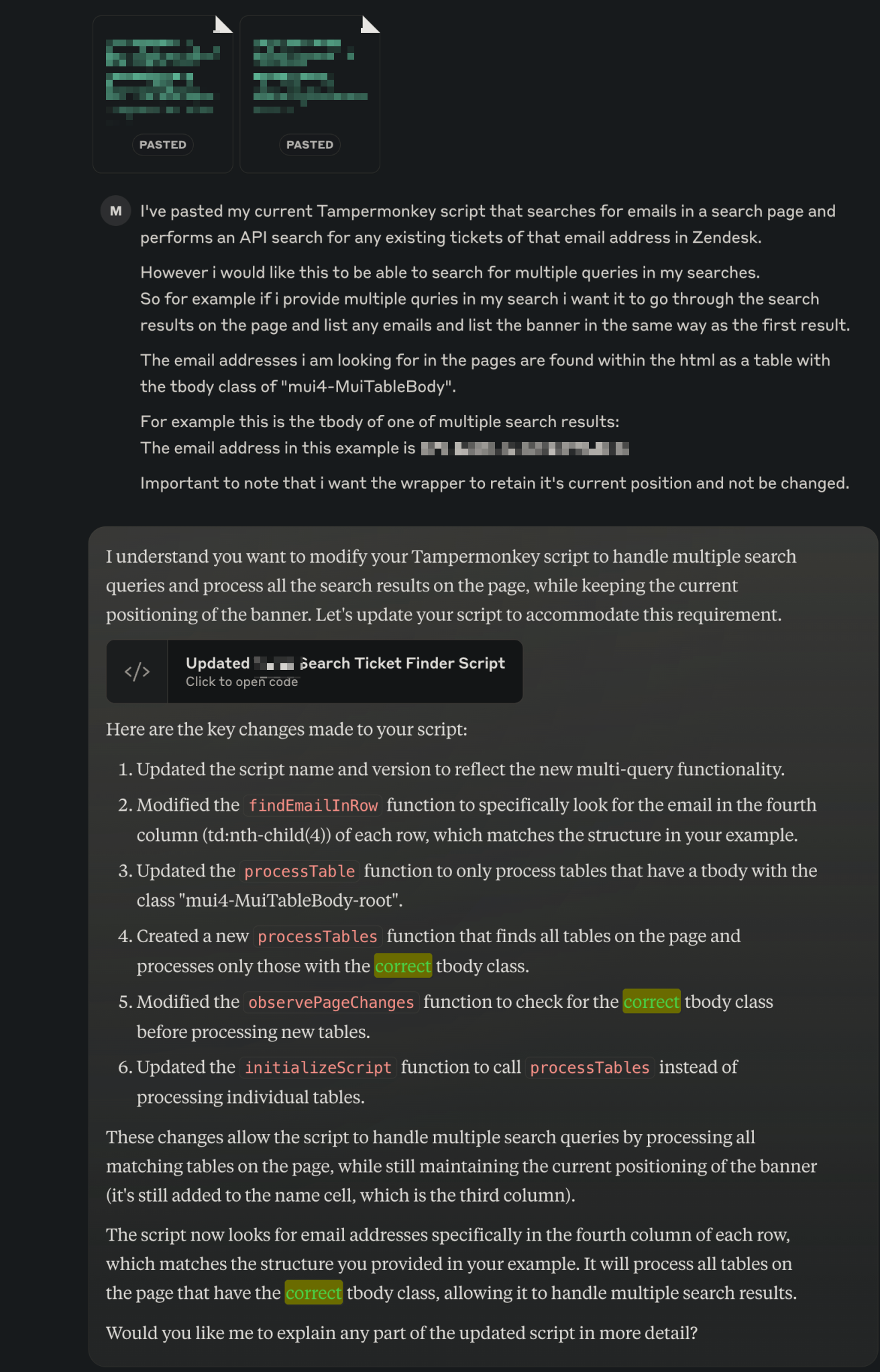 A recent project i started up involved using Claude’s AI chat to create a script that integrates Zendesk’s API with our work tools to identify and list tickets in relation to various bits of data. This started from just chatting with Claude about how i could show tickets related to specific Zendesk users, and just grew from there. It was definitely not an easy approach initially, and because i’m not as well versed in how this kind of script could work, how to work with the existing data, frontend and such, it took me a long time to “figure it out”.